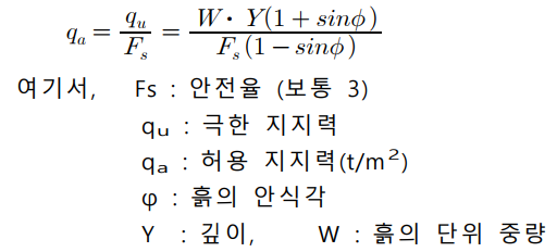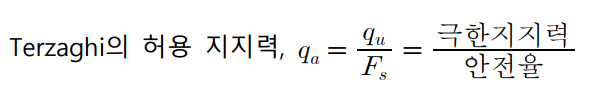 - 허용 지지력 : 극한 지지력을 규정된 안전율로 나눈 것이고 조립토일수록 양호하며 세립토 일수록 작다.
