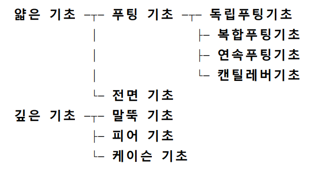 기초공은 구조물의 기본이 되는 것으로 기초공의 경계 및 시공이 불완전하다면 상부 구조물의 침하, 경사, 전도, 활동 등의 원인이 되어 구조물에 심각한 영향을 주게 된다. 대략적인 기초의 종류는 아래와 같다.
