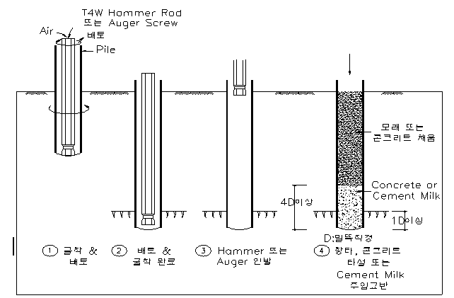 ① 말뚝 직경보다 50~100mm정도 큰 직경을 갖는 연속날개 또는 교반용 날개를 부착한 Auger로 지반을 선굴착 한 후 굴착공 내에 Cement Milk를 주입하고 Auger날개를 상하로 회전시켜 굴착공 내의 토사와 교반한 후 말뚝을 삽입하고 Drop or Hydraulic Hammer로 최종 경타방식으로 말뚝시공
